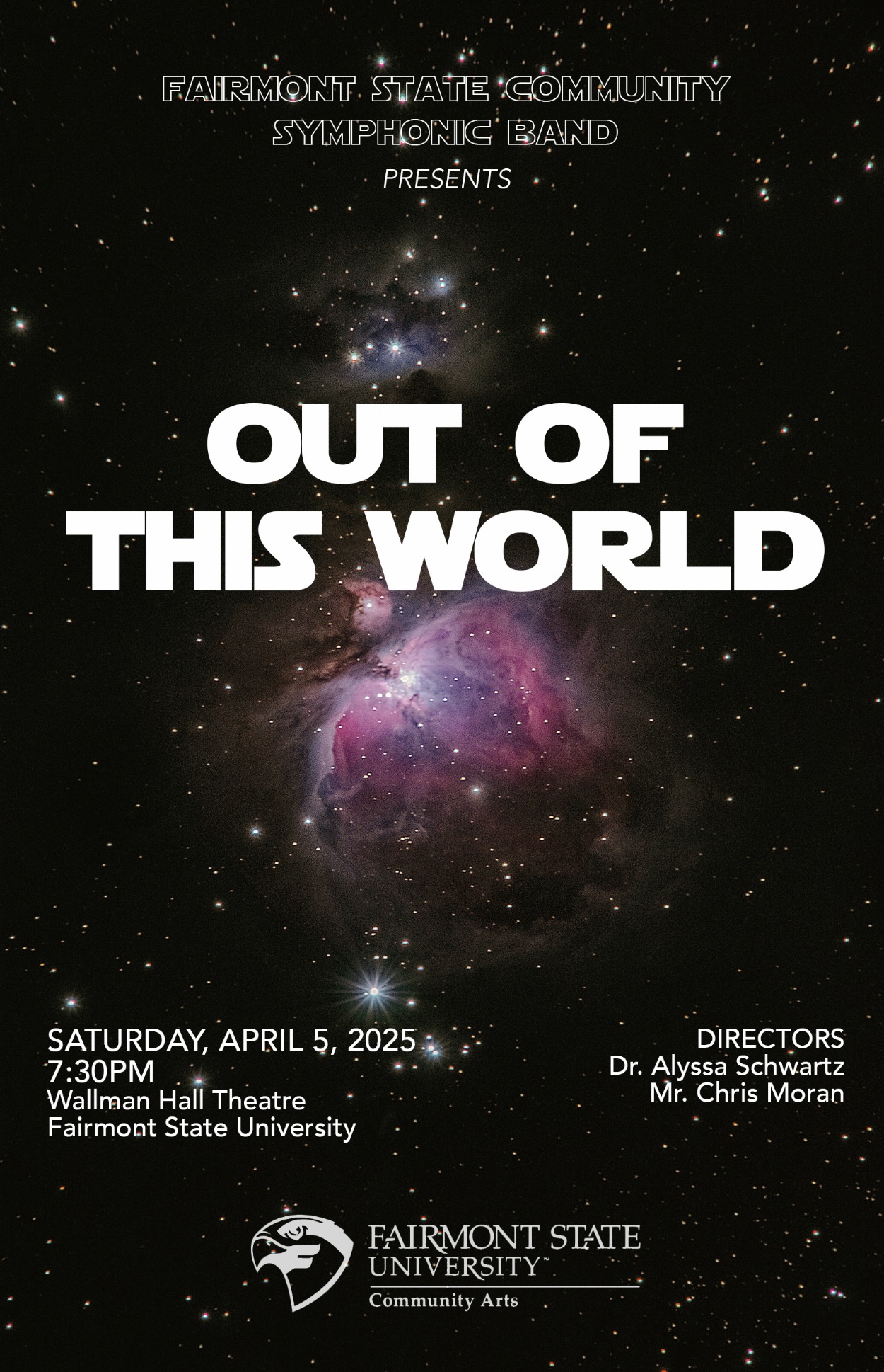 Out Of This World April 5, 2025 7:30 pm Fairmont, WV Wallman Hall Theatre This one hour space-themed symphonic band concert will feature selections from Holst’s “The Planets”, Superman, Star Wars, and more!